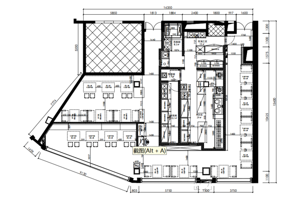 该餐厅为异形空间,将厨房放在中区,可方便就餐分区,也能达到不影响消防通道(红色箭头为消防通道)的使用。